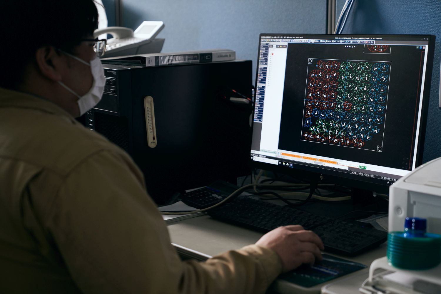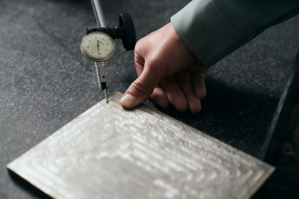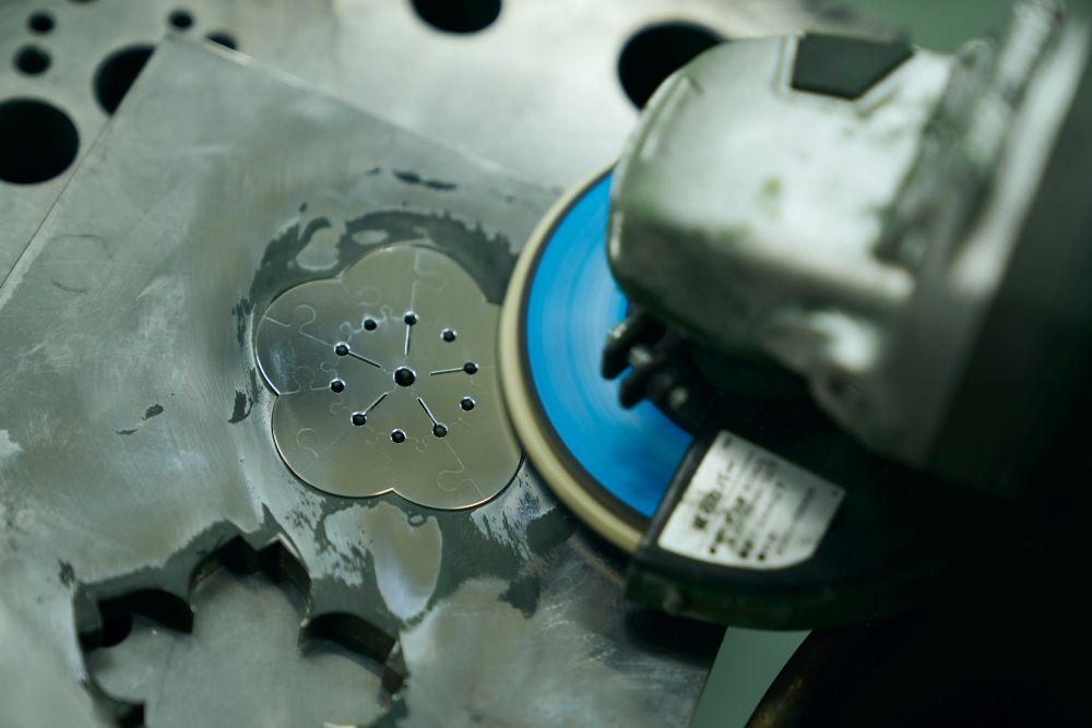 After the cutting, each piece can have burrs about 0.05mm in size. So they are further polished while a craftsperson inspects its profile by eye
