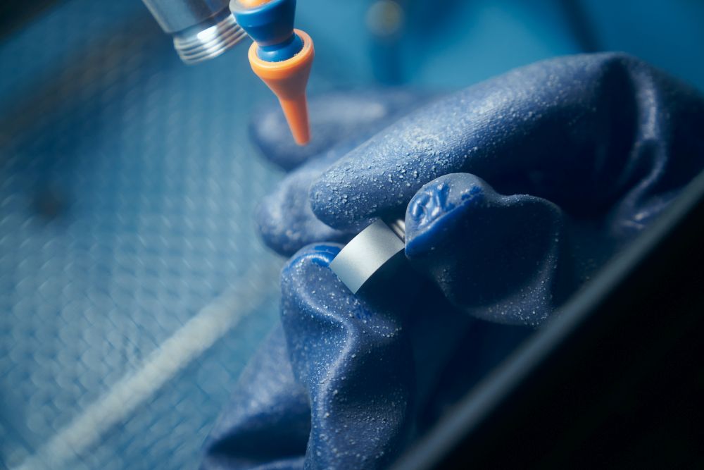After the profiles are polished, metal powder is removed and the pieces are further polished by blasting them with diamond particles